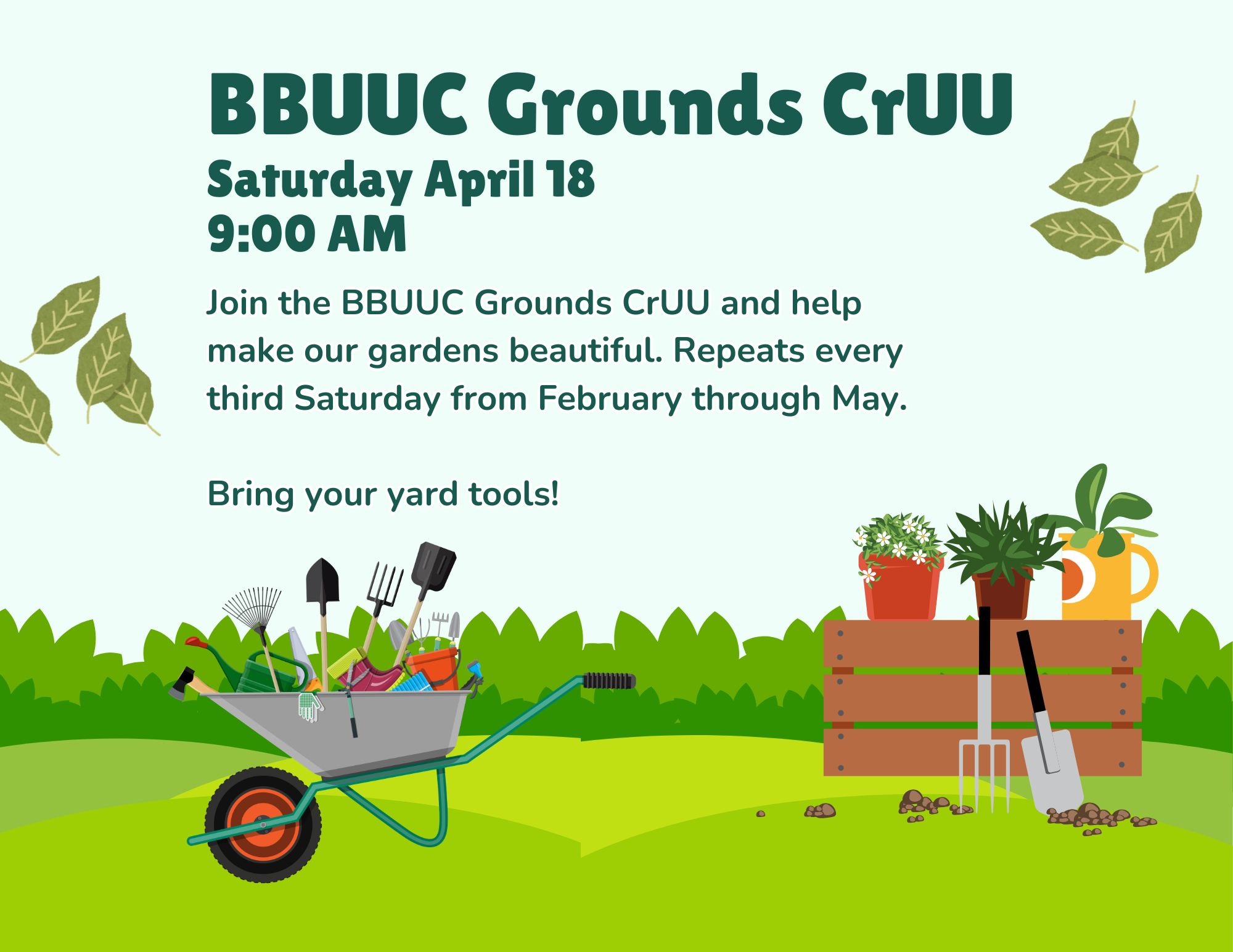 Grounds CrUU Gardening Team 04/18/2026 • office@bbuuc.org Saturday, April 18, 20269:00 am - 12:00 pmJoin the BBUUC Grounds CrUU and help make our gardens beautiful. Every third Saturday February through May.Bring your yard tools![powerpress]
